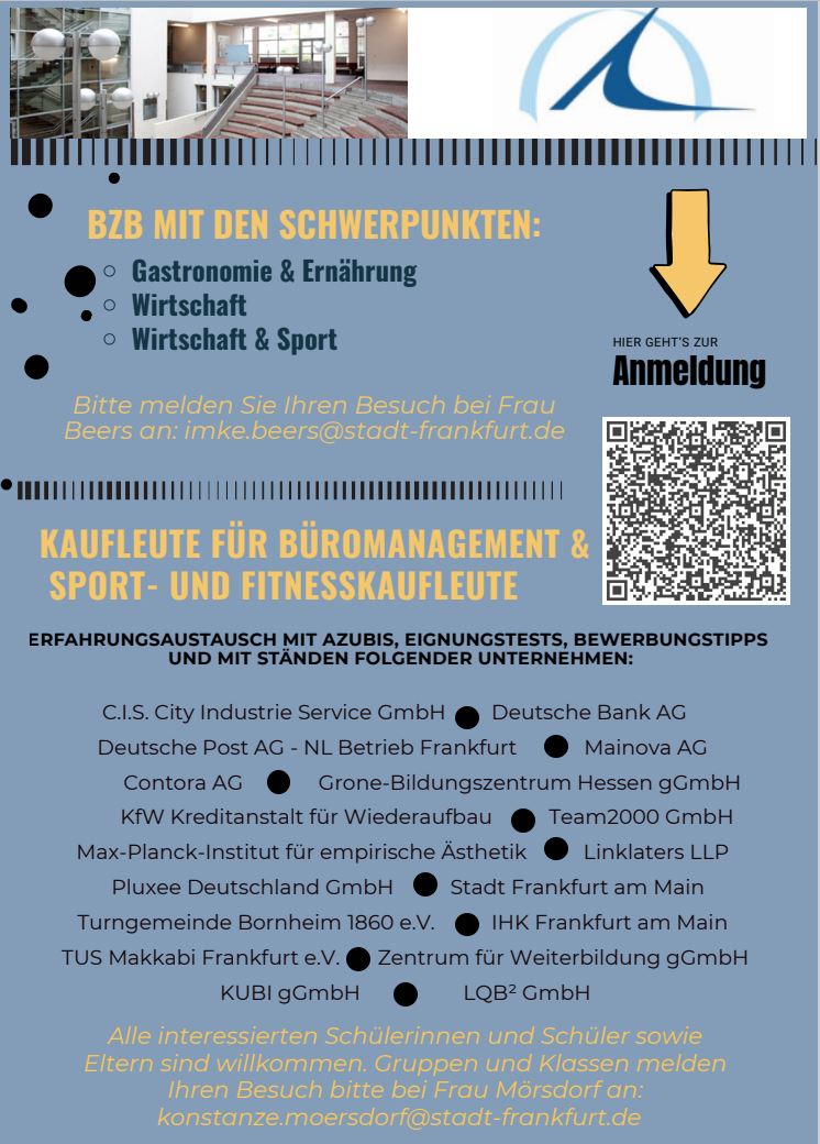 TAG DER OFFENEN BERUFSSCHULE am 13.11.2025, 9:00-14:00 UHR S A V E T H E D A T E Bildungsgänze zur Berufsvorbereitung (BZB)Kaufleute für Büromanagement Sport- und Fitnesskaufleute BÜA MIT DEN SCHWERPUNKTEN: Ernährung Handel Wirtschaft Körperpflege Bitte melden Sie Ihren Besuch bei Frau Beers an: imke.beers@stadt-frankfurt.de KAUFLEUTE FÜR BÜROMANAGEMENT UND SPORT-UND FITNESSKAUFLEUTE Erfahrungsaustausch mit Azubis, Eignungstests, Bewerbungstipps und mit Ständen folgender Unternehmen:C.I.S. City Industrie Service GmbH - Deutsche Bank AG Deutsche Post AG - NL Betrieb Frankfurt - Mainova AG Grone-Bildungszentrum Hessen gGmbH Contora AG KfW Kreditanstalt für Wiederaufbau - Team2000 GmbH Max-Planck-Institut für empirische Ästhetik - Linklaters LLP Pluxee Deutschland GmbH - Stadt Frankfurt am Main Turngemeinde Bornheim 1860 e.V. - IHK Frankfurt am Main TUS Makkabi Frankfurt e.V. Zentrum für Weiterbildung gGmbHAlle interessierten Schülerinnen und Schüler sowie Eltern sind willkommen. Bei Gruppen und Klassen melden Sie Ihren Besuch bitte bei Frau Mörsdorf an: konstanze.moersdorf@stadt-frankfurt.de